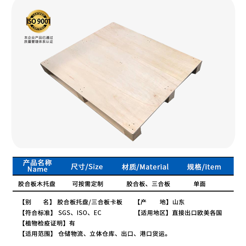 與熏蒸木托盤(實木托盤)相比,免熏蒸木托盤(膠合板托盤)具有以下特點: