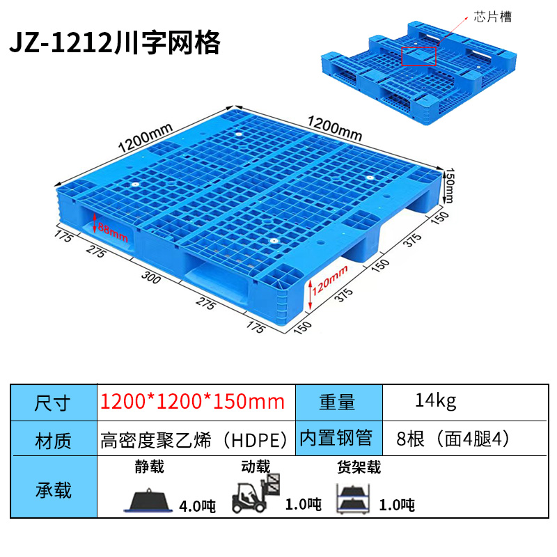 托盤設(shè)有RFID芯片槽位置,可插電子芯片,高效管理貨物,是智能倉儲、物流電商、立體貨架等行業(yè)的得力助手